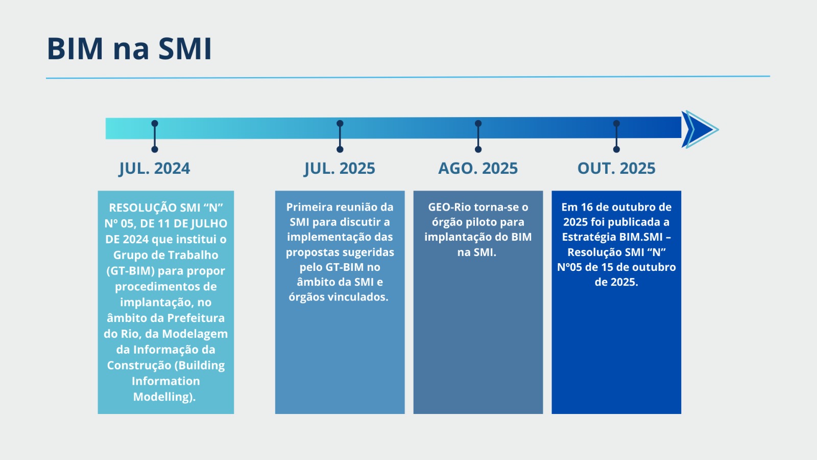 • Divulgação das principais ações empreendidas pela Secretaria Municipal de Infraestrutura (SMI) do Rio de Janeiro para adoção gradativa do BIM no âmbito da Secretaria e dos seus órgãos vinculados, em obediência ao artigo 19 da Lei 14.133/21.