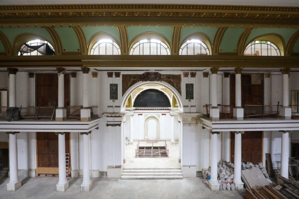 A obra contempla a restauração das fachadas históricas, com recuperação de ornamentos, elementos decorativos e esquadrias originais, além da requalificação de ambientes emblemáticos do interior do edifício, como o hall principal, os foyers dos pavimentos e os salões principais, incluindo o espaço sob a cúpula. Também estão sendo realizados serviços de tratamento estrutural, recuperação de alvenarias, reforço de estruturas comprometidas e recomposição de elementos arquitetônicos deteriorados pelo tempo.